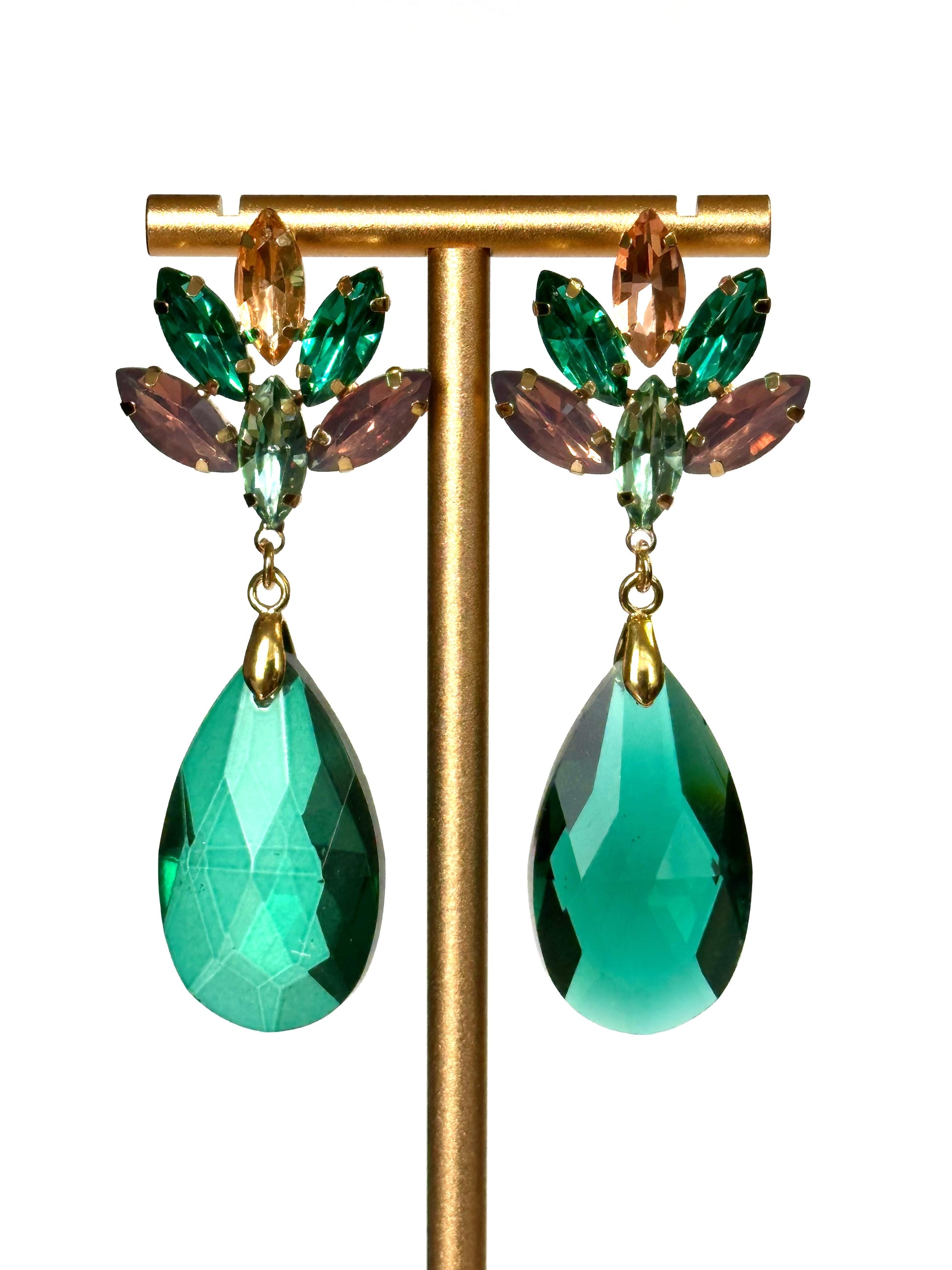 CARAVANAS DE CRSITAL VERDE AZULADO CON BROCHE EN TONOS VERDES, ROSA Y CHAMPAGNE.